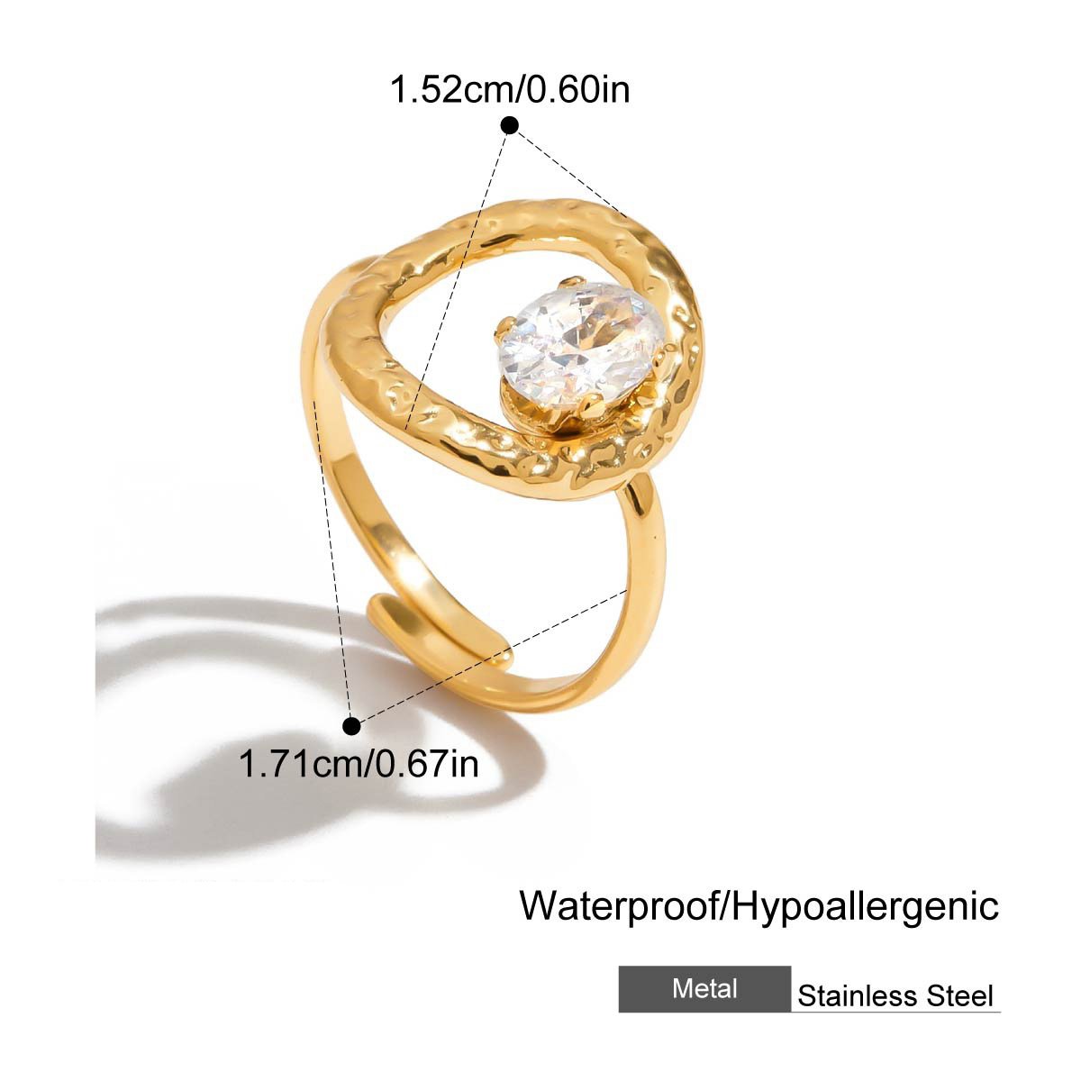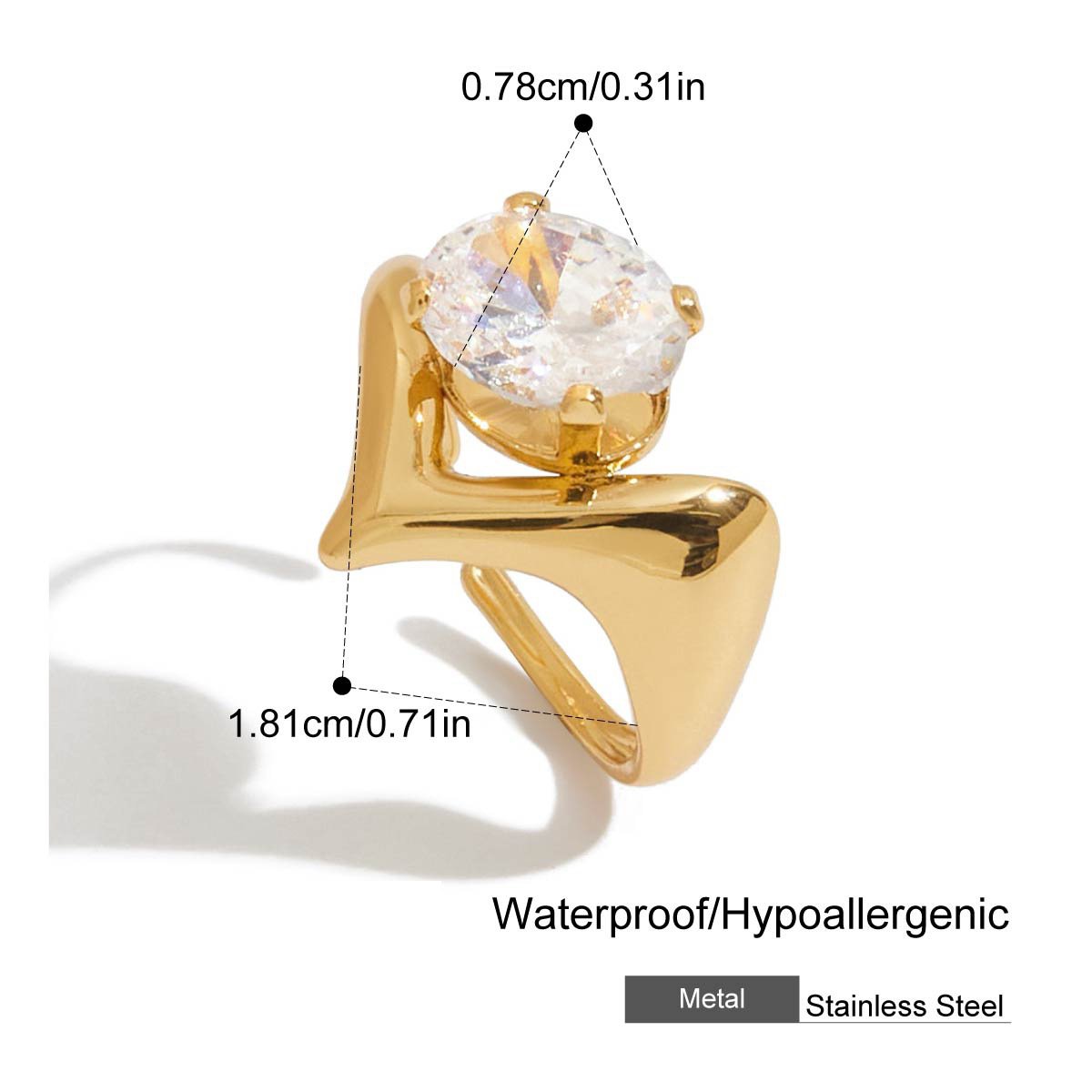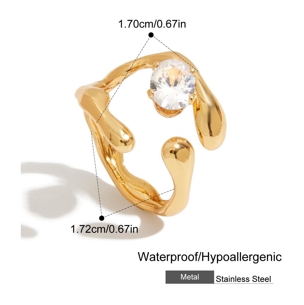 Gold Irregular Zircon Adjustable Ring This 18K gold plated irregular zircon adjustable ring is designed for B2B wholesale partners, featuring a polished stainless steel base, a free-form organic band, and a central round cubic zirconia crystal for a modern, minimalist look. With an open adjustable design (inner diameter 1.70-1.72cm), it offers a comfortable fit for most finger sizes, while the lightweight construction ensures all-day wearability. The waterproof, hypoallergenic, and nickel-free construction ensures irritation-free, long-lasting wear, while the non-tarnish plating preserves the warm gold finish and brilliant crystal sparkle through daily use. Ideal for resale in fashion boutiques, online stores, and jewelry retail chains, this ring transitions seamlessly from casual to special occasions. We offer flexible MOQs, competitive bulk pricing, and private labeling options to support your business growth. All products undergo strict quality control to ensure durability and consistency across every batch. Partner with us to elevate your inventory with on-trend, high-demand jewelry pieces that appeal to modern consumers.