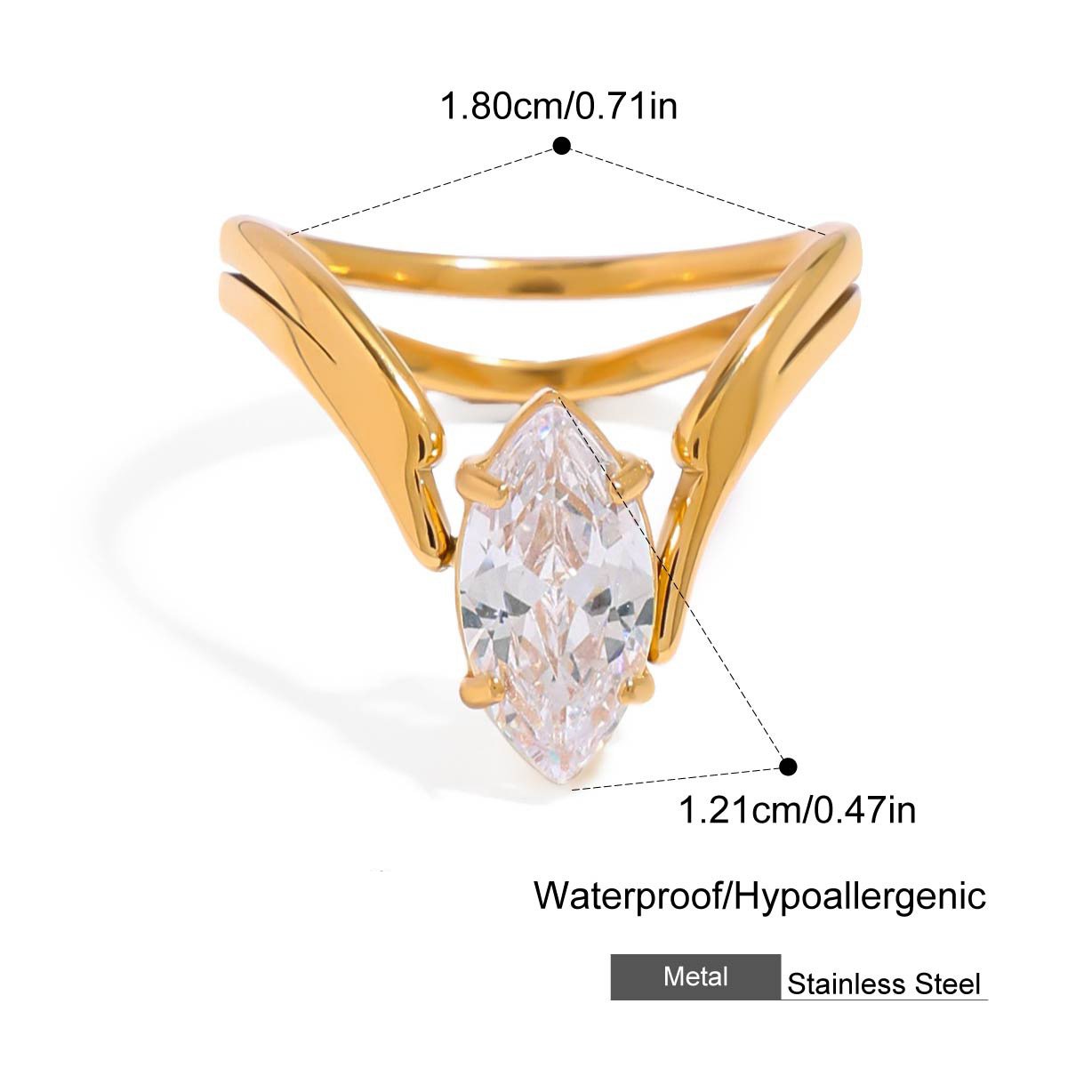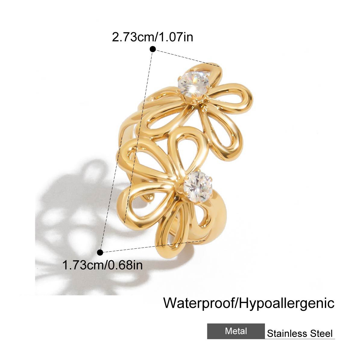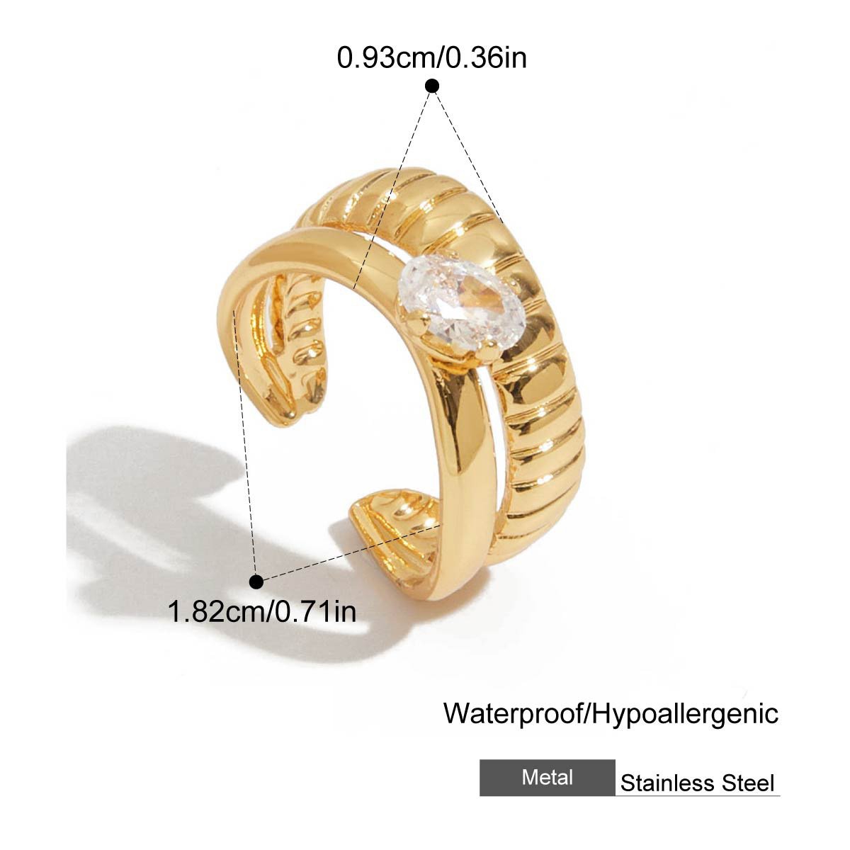 Gold Irregular Zircon Adjustable Ring This 18K gold plated irregular zircon adjustable ring is designed for B2B wholesale partners, featuring a polished stainless steel base, a free-form organic band, and a central round cubic zirconia crystal for a modern, minimalist look. With an open adjustable design (inner diameter 1.70-1.72cm), it offers a comfortable fit for most finger sizes, while the lightweight construction ensures all-day wearability. The waterproof, hypoallergenic, and nickel-free construction ensures irritation-free, long-lasting wear, while the non-tarnish plating preserves the warm gold finish and brilliant crystal sparkle through daily use. Ideal for resale in fashion boutiques, online stores, and jewelry retail chains, this ring transitions seamlessly from casual to special occasions. We offer flexible MOQs, competitive bulk pricing, and private labeling options to support your business growth. All products undergo strict quality control to ensure durability and consistency across every batch. Partner with us to elevate your inventory with on-trend, high-demand jewelry pieces that appeal to modern consumers.
