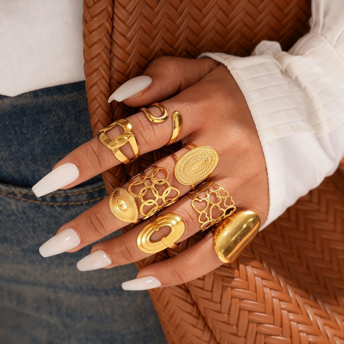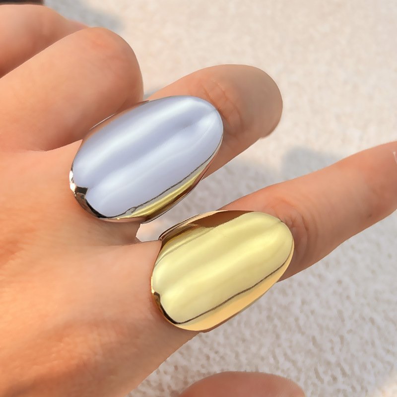The design inspiration of this ring comes from contemporary art and minimalist fashion, achieving a perfect balance between simplicity and power. The smooth inner ring ensures comfortable wearing, making it suitable for daily wear and a striking accessory. Whether worn alone or paired with the same gold earrings, this ring can easily enhance the modern and elegant temperament of any style.