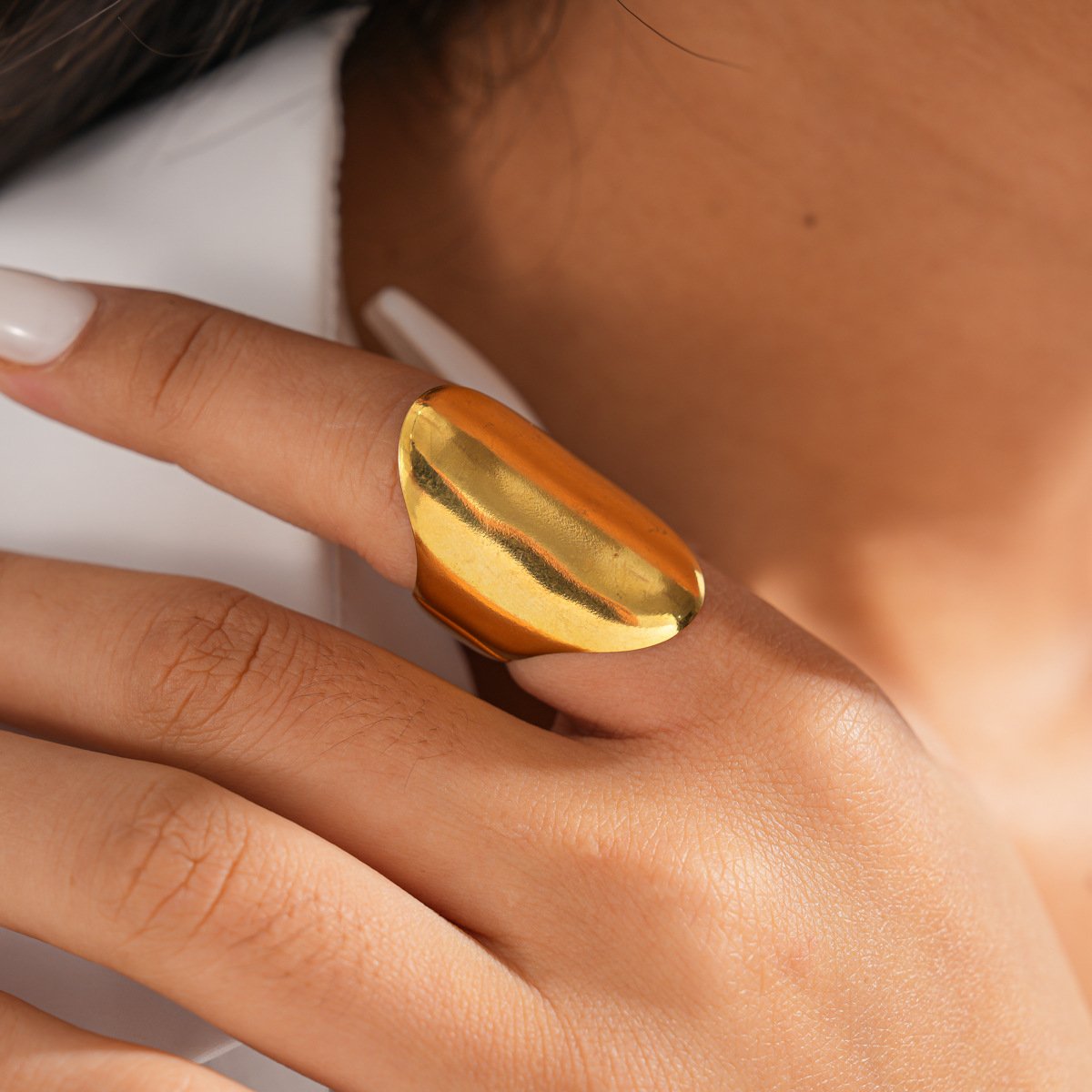 This modern gold ring is known for its sculptural wide ring design and mirror polishing process. The ring has simple and smooth lines, a soft and rounded surface, and can cleverly reflect light, showing a bold and exquisite temperament on the hand.