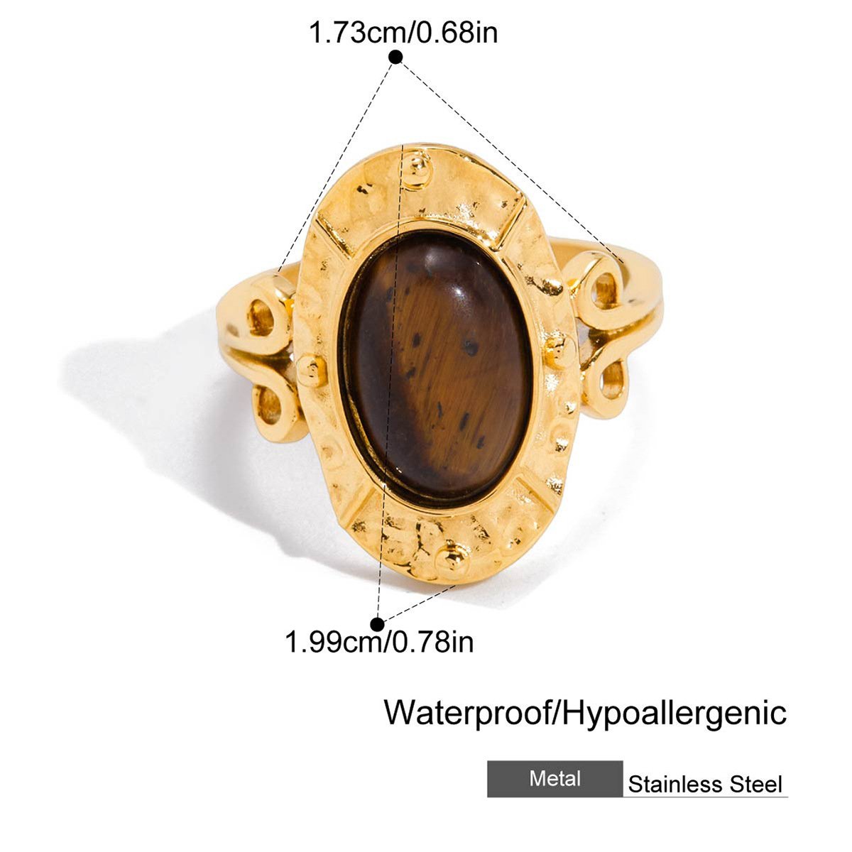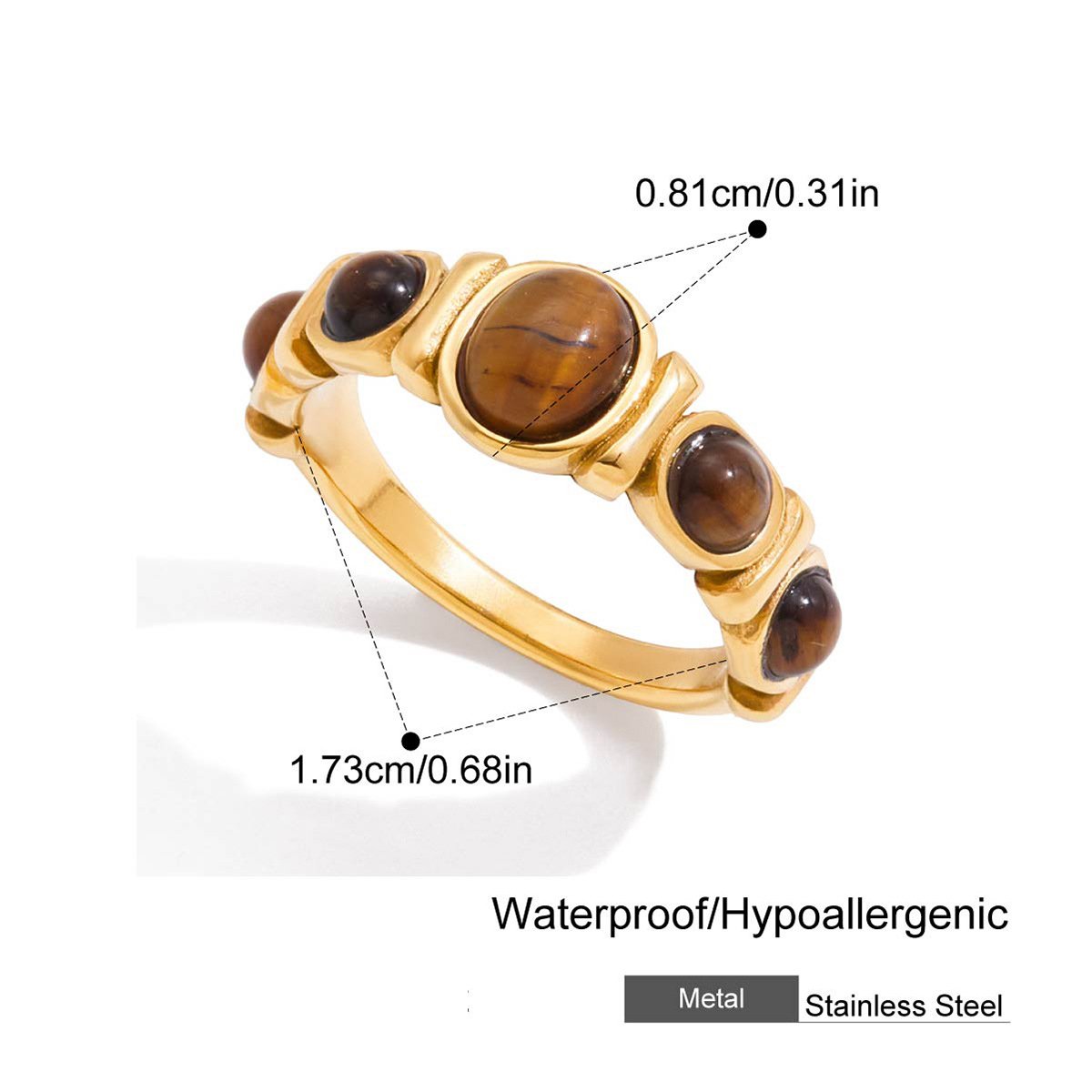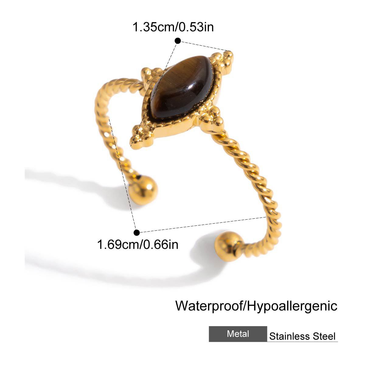 Gold Tiger Eye Stone Stainless Steel Ring This 18K gold plated tiger eye stone stainless steel ring is designed for B2B wholesale partners, featuring a polished stainless steel base, a central oval tiger eye stone, and smaller accent stones for a natural, earthy look.. The waterproof, hypoallergenic, and nickel-free construction ensures irritation-free, long-lasting wear, while the non-tarnish plating preserves the warm gold finish and rich tiger eye color through daily use. Ideal for resale in fashion boutiques, online stores, and jewelry retail chains, this ring transitions seamlessly from casual to special occasions. We offer flexible MOQs, competitive bulk pricing, and private labeling options to support your business growth. All products undergo strict quality control to ensure durability and consistency across every batch. Partner with us to elevate your inventory with timeless, high-demand jewelry pieces that appeal to modern consumers.