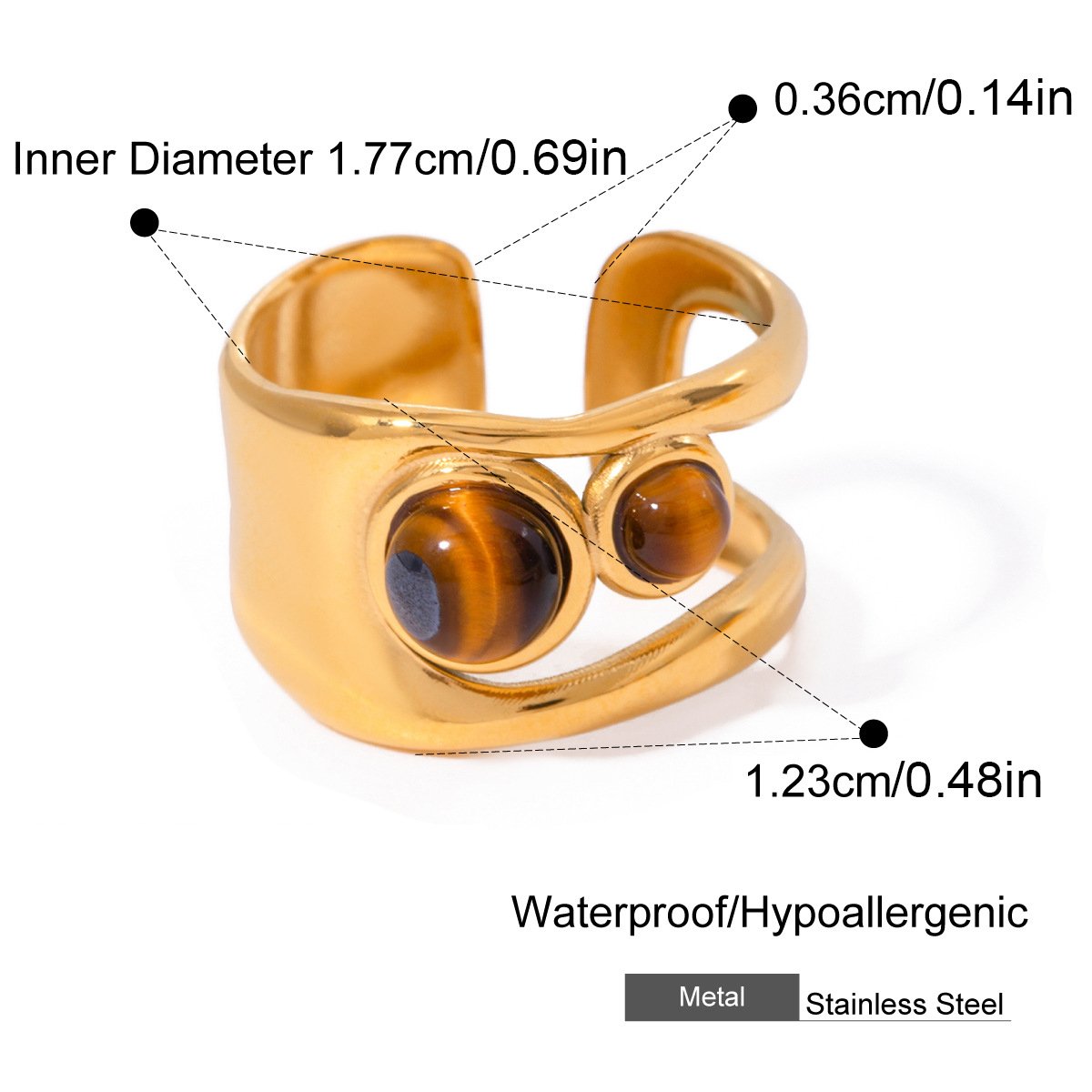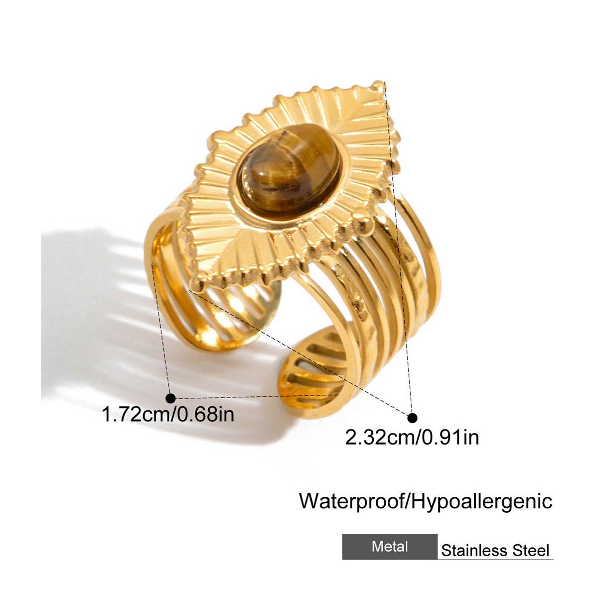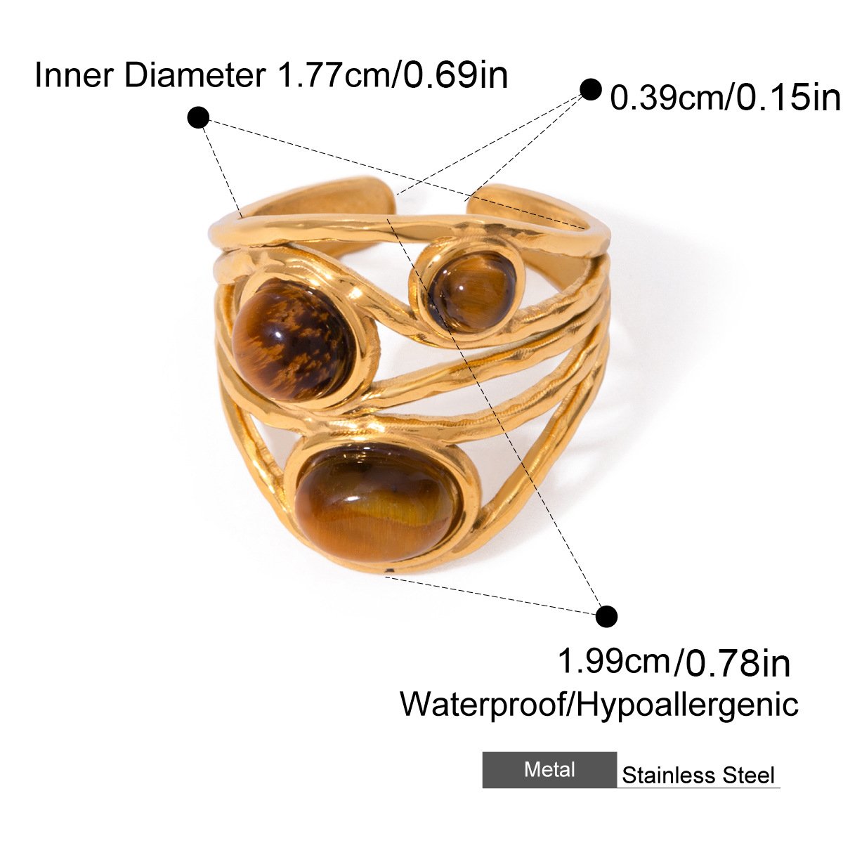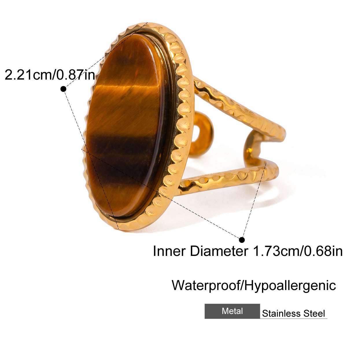 Gold Tiger Eye Stone Stainless Steel Ring This 18K gold plated tiger eye stone stainless steel ring is designed for B2B wholesale partners, featuring a polished stainless steel base, a central oval tiger eye stone, and smaller accent stones for a natural, earthy look.. The waterproof, hypoallergenic, and nickel-free construction ensures irritation-free, long-lasting wear, while the non-tarnish plating preserves the warm gold finish and rich tiger eye color through daily use. Ideal for resale in fashion boutiques, online stores, and jewelry retail chains, this ring transitions seamlessly from casual to special occasions. We offer flexible MOQs, competitive bulk pricing, and private labeling options to support your business growth. All products undergo strict quality control to ensure durability and consistency across every batch. Partner with us to elevate your inventory with timeless, high-demand jewelry pieces that appeal to modern consumers.