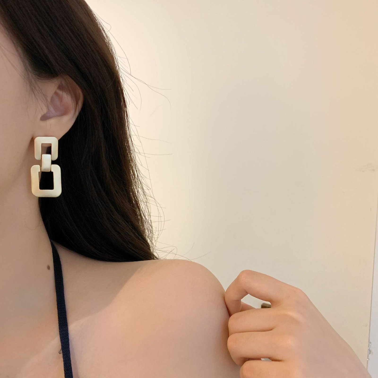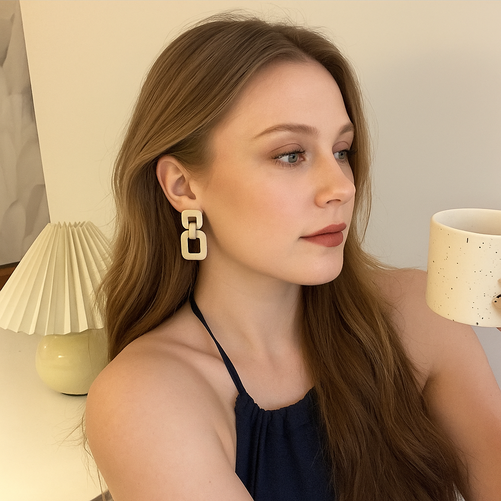Designed with interconnected square shapes, the earrings add movement and dimension withoutoverwhelming the outfit. Their minimalist structure makes them easy to pair with both casual andformal looks–from office wear to evening occasions.