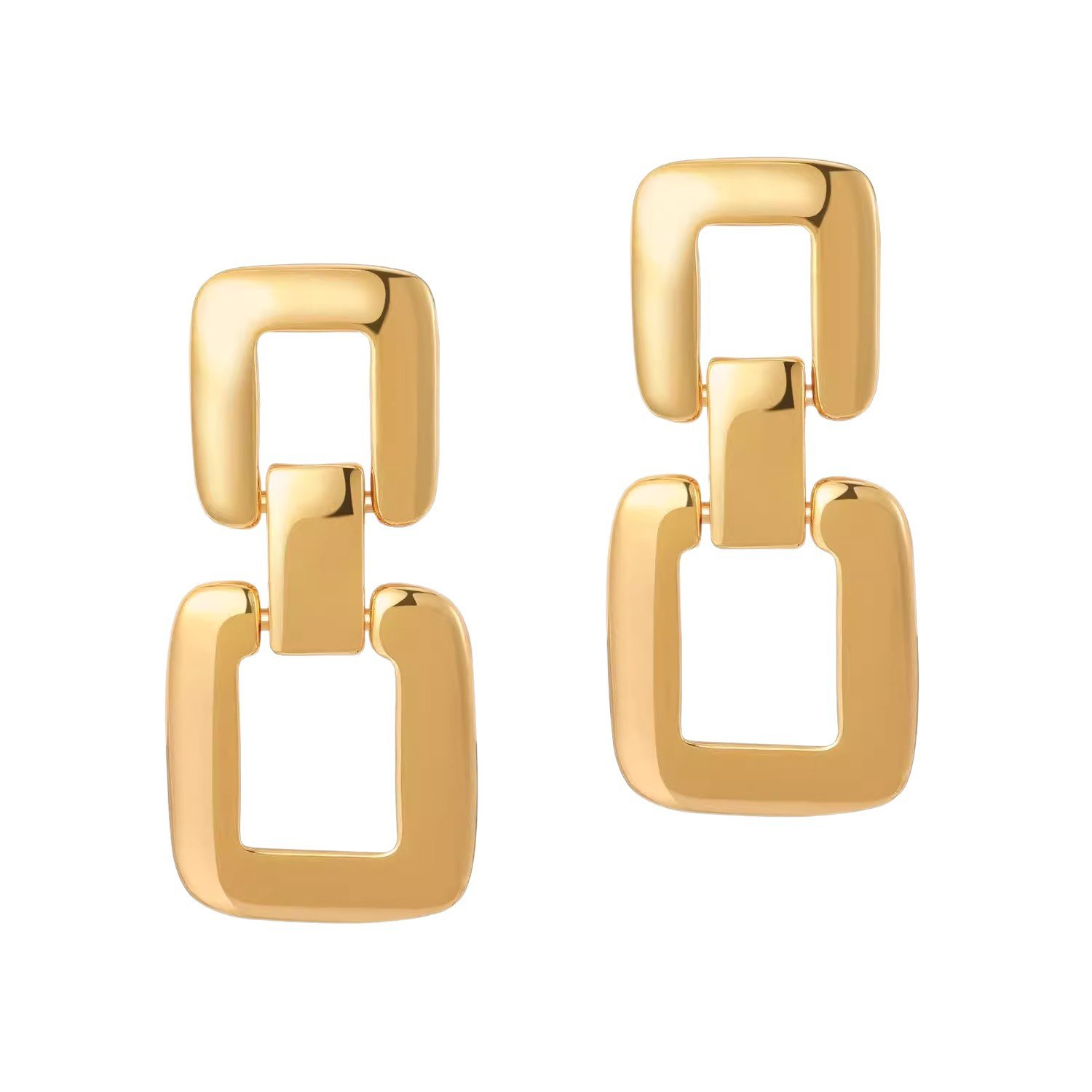 These gold geometric drop earrings feature a bold square-link silhouette that blends modernminimalism with statement elegance. The clean lines and polished gold finish create a refined yeteye-catching look, ideal for contemporary women.