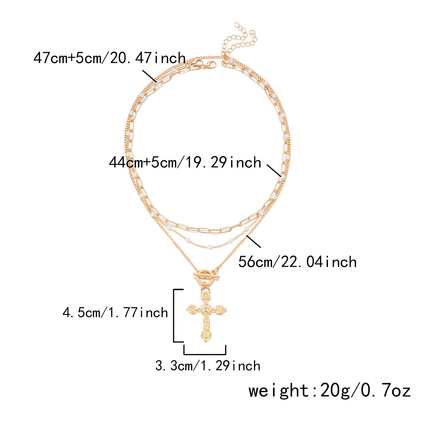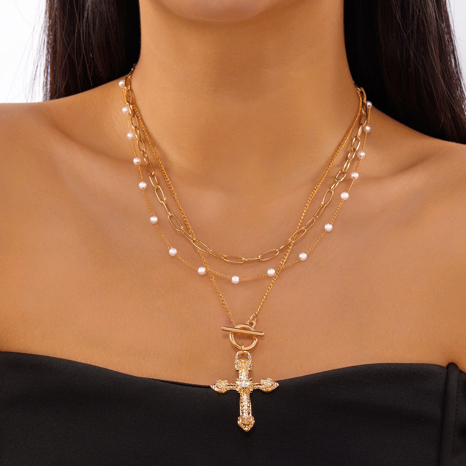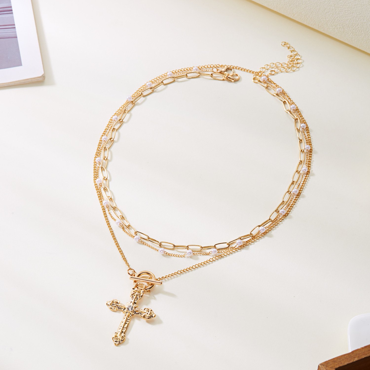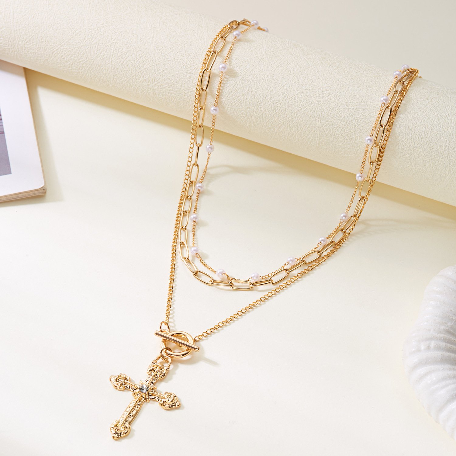 Multi-Layer Gold Crystal Cross Pendant Necklace | 18K Plated Paperclip Chain Statement NecklaceAvailability: 1989 in stock
