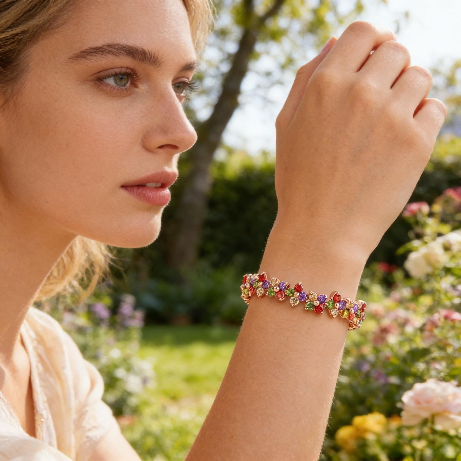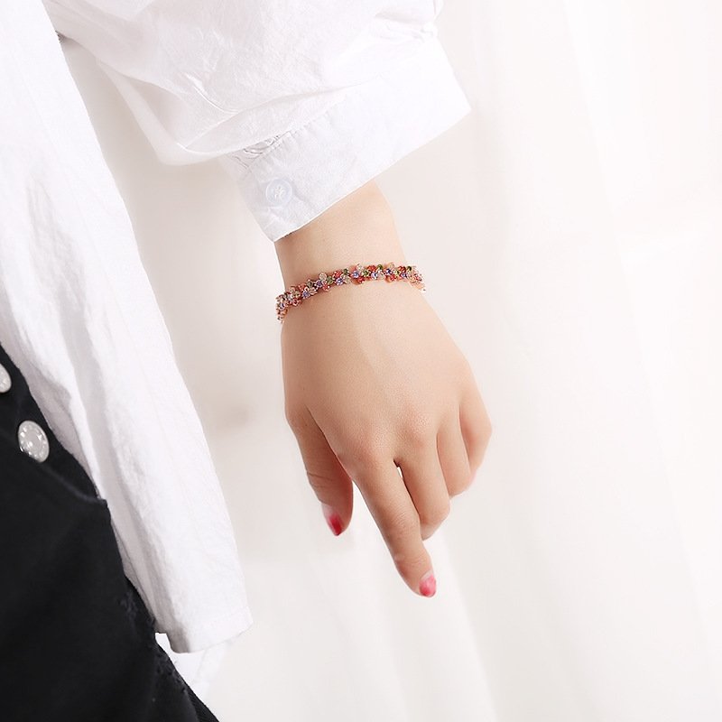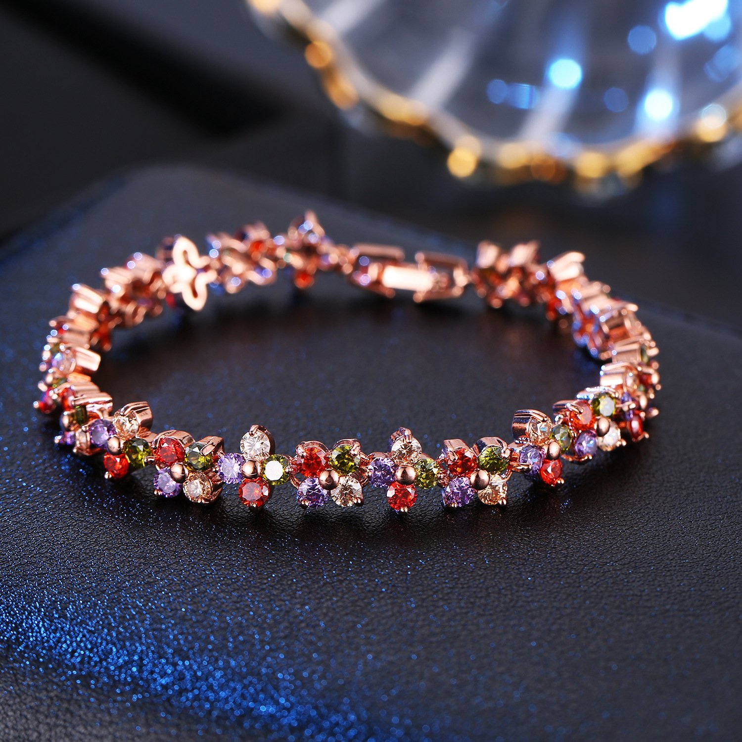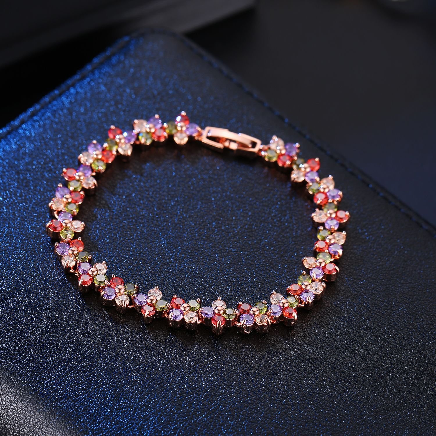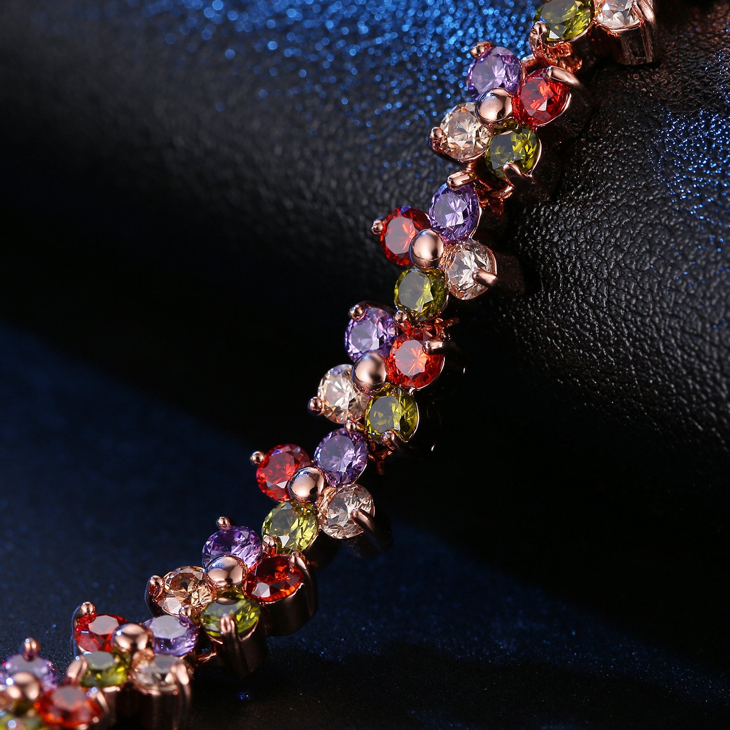 This Rose Gold Rainbow Crystal Floral Bracelet blends romantic floral design with vibrant sparkle. It features an 18K rose gold-plated base, adorned with clusters of rainbow-hued cubic zirconia petals, creating a continuous, eye-catching floral pattern.